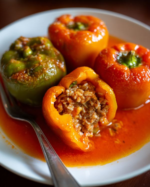 Pour half of the tomato sauce into a baking dish, then place the stuffed peppers on top.